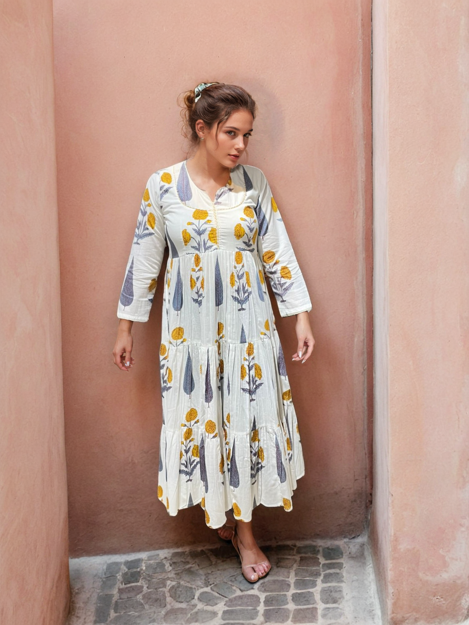Embrace timeless elegance with our handcrafted Cotton Yellow Buta Handblock Dress by Anokhi Textiles. This stunning floor-length dress features a delicate blue floral buta print, meticulously handblock printed using traditional techniques.