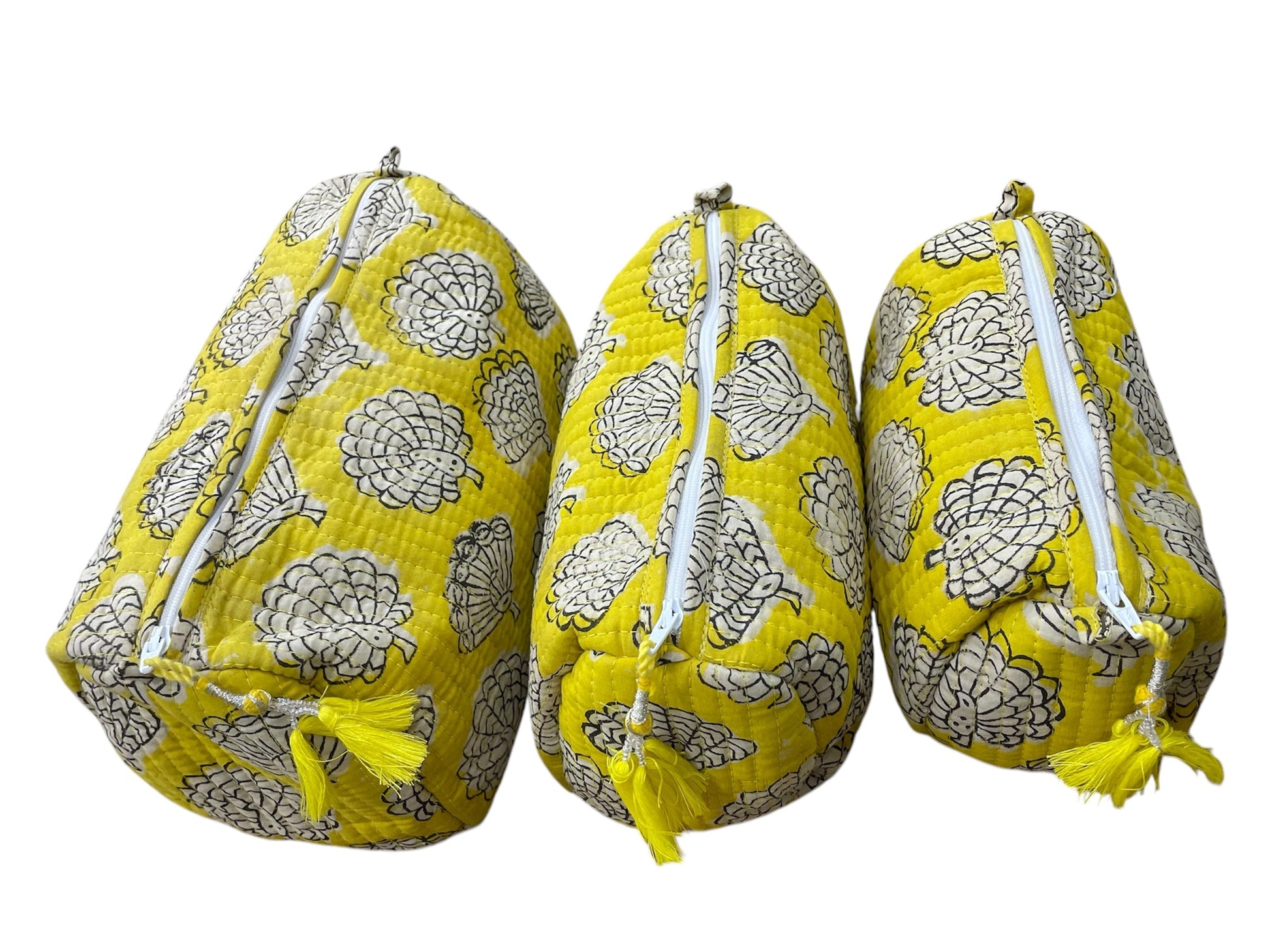 The pouches, which come in three different sizes, have been block printed and expertly hand-stitched to offer enough room to be used as a travel kit or to hold one's necessities, such as makeup, stationery, or jewellery. For easier access and storage, the pouches feature a zipper closure. A waterproof liner inside each of the three pouches ensures that no component will leak out in cases of spillage.