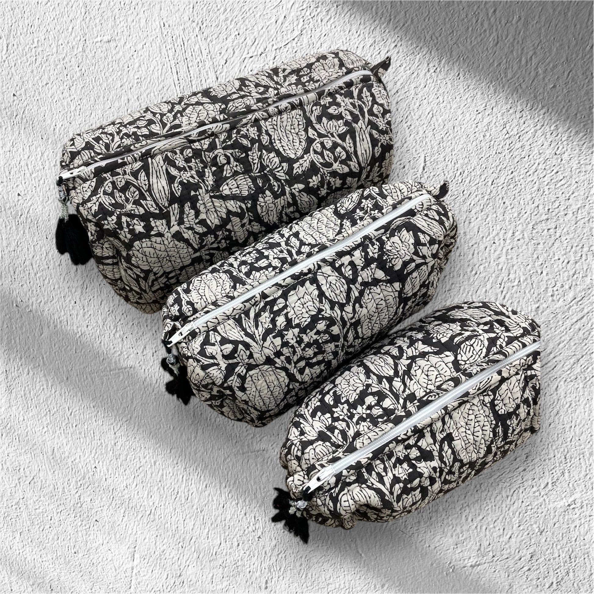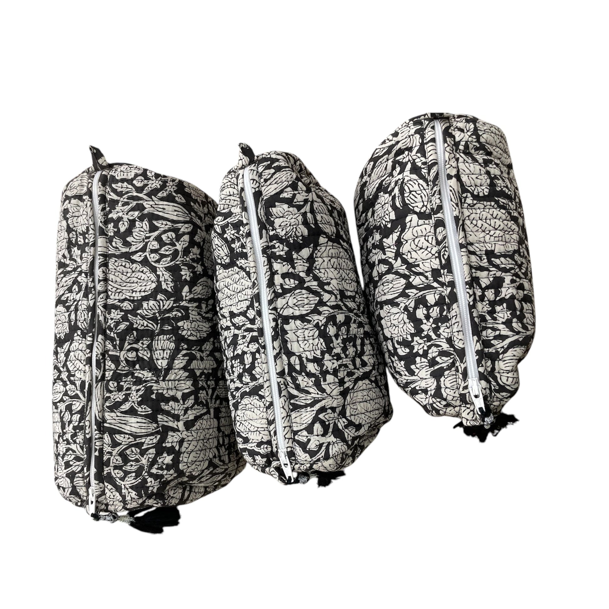 The pouches, which come in three different sizes, have been block printed and expertly hand-stitched to offer enough room to be used as a travel kit or to hold one's necessities, such as makeup, stationery, or jewellery. For easier access and storage, the pouches feature a zipper closure. A waterproof liner inside each of the three pouches ensures that no component will leak out in cases of spillage.