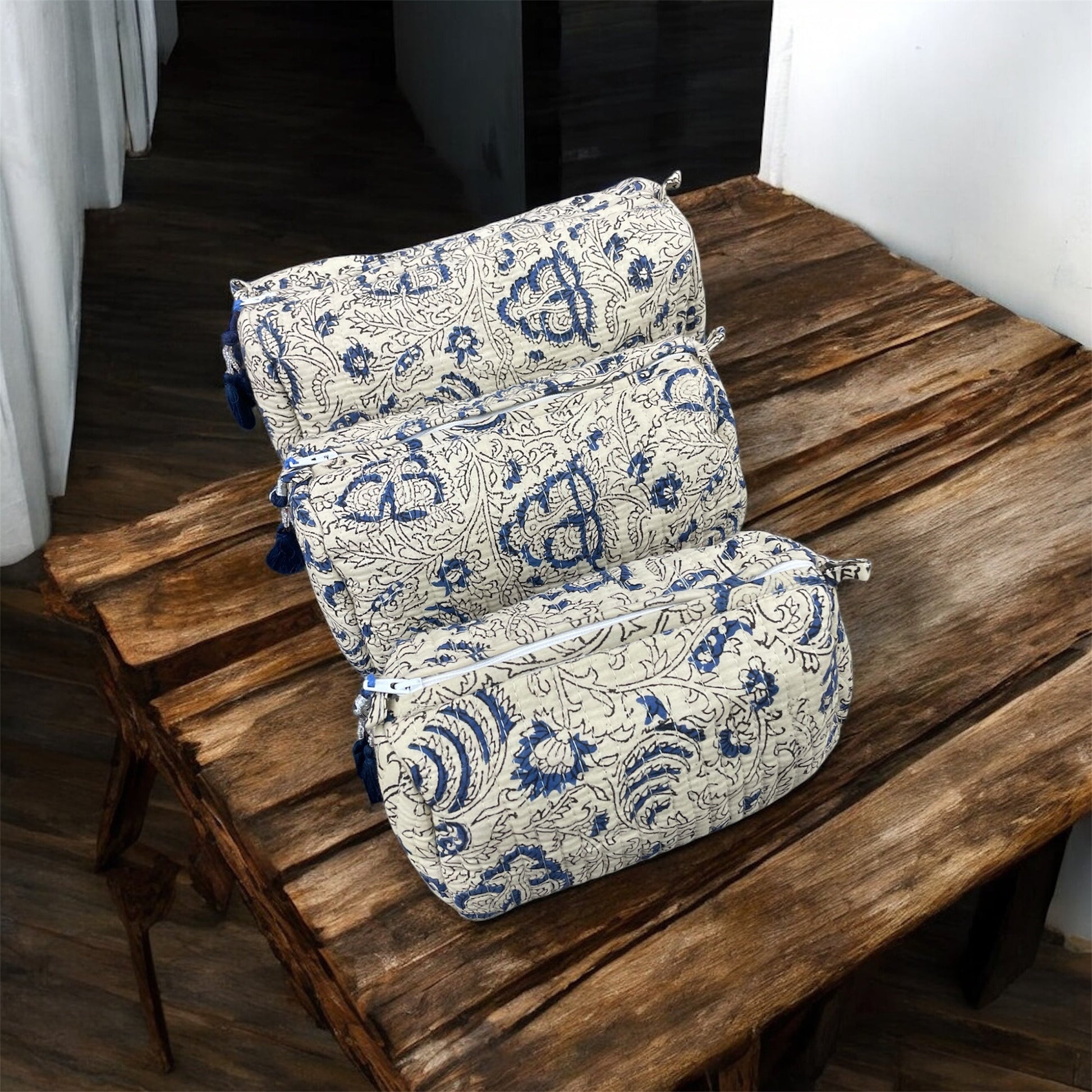 The pouches, which come in three different sizes, have been block printed and expertly hand-stitched to offer enough room to be used as a travel kit or to hold one's necessities, such as makeup, stationery, or jewellery. For easier access and storage, the pouches feature a zipper closure. A waterproof liner inside each of the three pouches ensures that no component will leak out in cases of spillage.