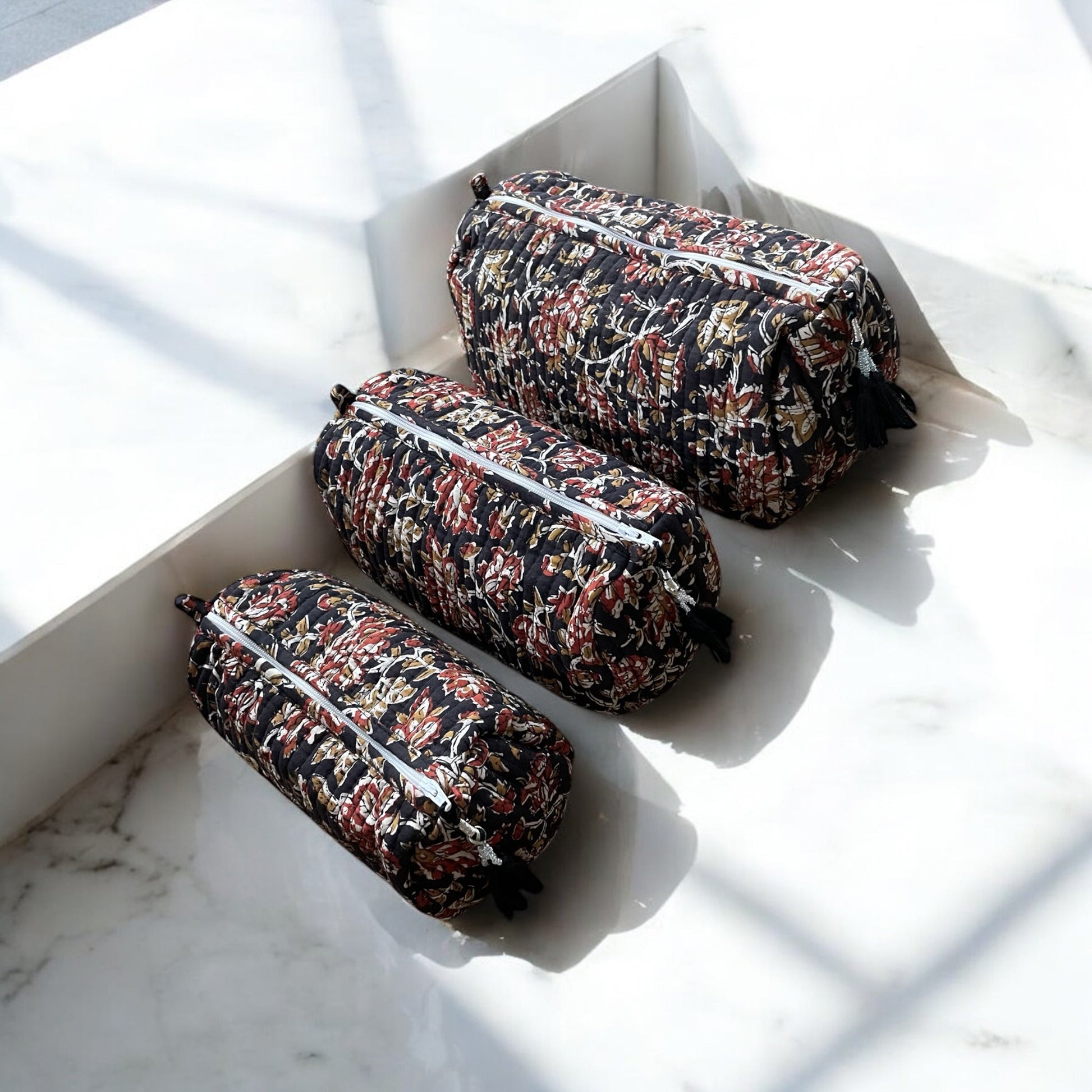 The pouches, which come in three different sizes, have been block printed and expertly hand-stitched to offer enough room to be used as a travel kit or to hold one's necessities, such as makeup, stationery, or jewellery. For easier access and storage, the pouches feature a zipper closure. A waterproof liner inside each of the three pouches ensures that no component will leak out in cases of spillage.